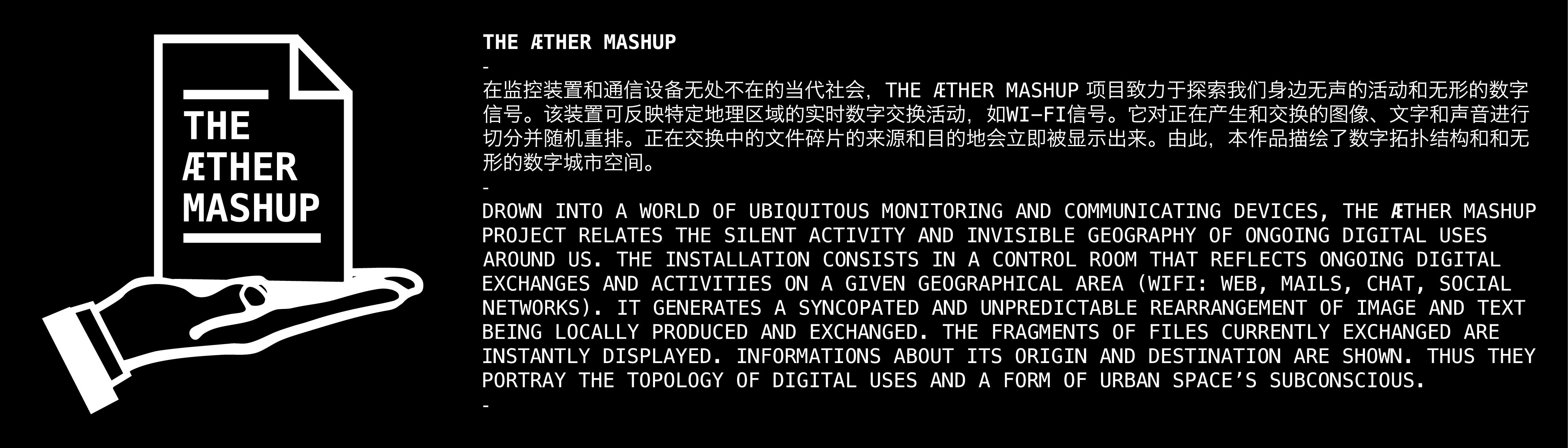 Aether Mashup is an interactive installation that explores ongoing digital exchanges and activities on a given geographical area. During a one-month residency program in the art village of Caochangdi (near Beijing),