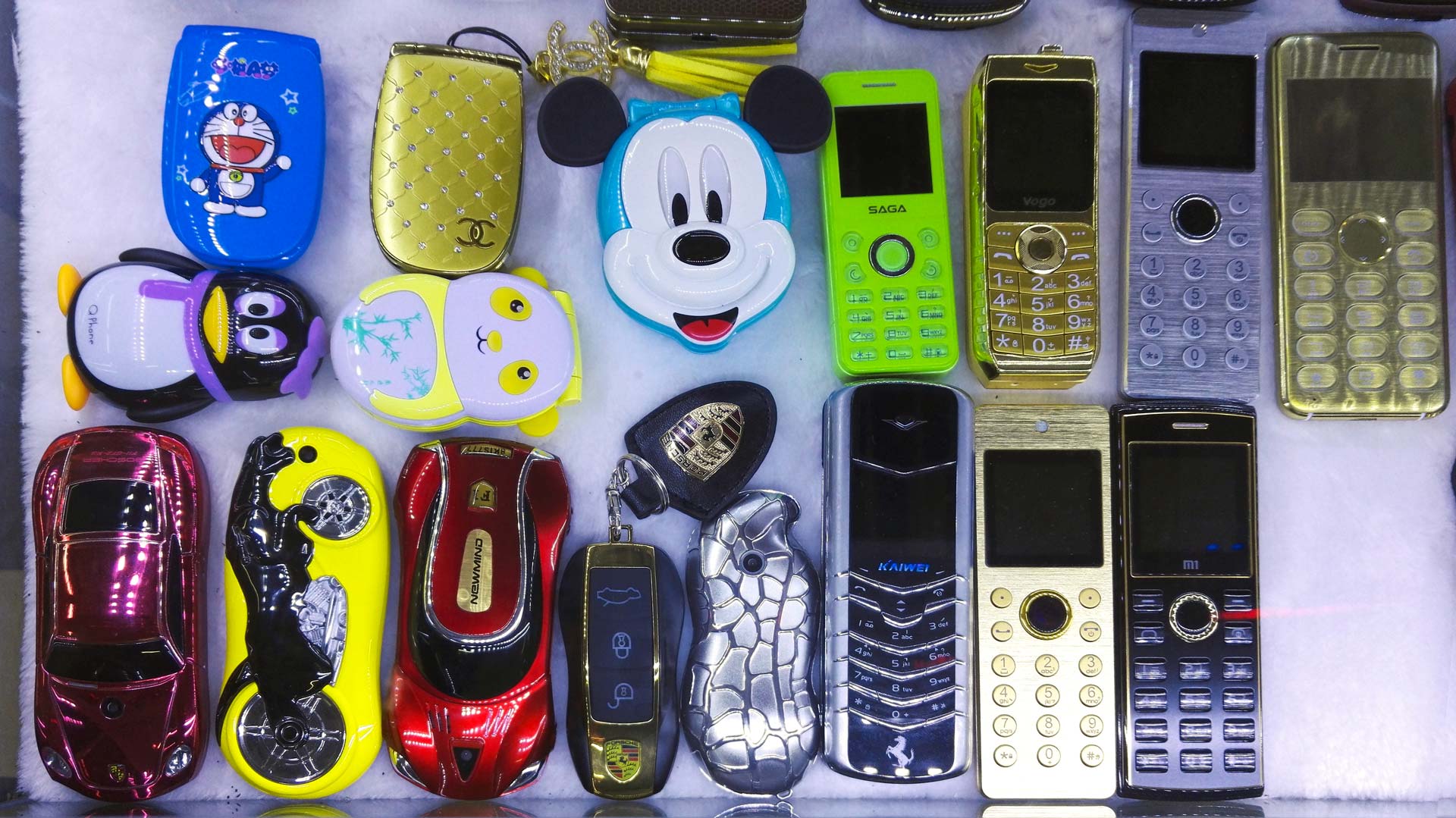In this collection, a Buddha Phone, becomes a virtual altar by pressing a special key. The “smallest in the world” or Prisoner Phone is made of 99% plastic and is barely detectable by the authorities. There’s the Taser Phone, marketed as a self-defense weapon, or the Sound System Phone, catering for China’s pensioners as it can broadcast loud sound outdoors, being heard above the din of the public dances they love. It also comes with several gigabytes of old-fashioned communist songs that Chinese pensioners are particularly keen on. Other curious devices include strawberry or car-shaped phones, devices with in-built electric razors, lighters, power banks, video projectors and other impressive features.